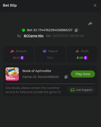 $1,500 Weekend Multiplier Battle Hello Everybody! We are happy to announce a new weekend-long tournament with the Spinomenal provider. It runs from September 23 at 1:00 pm GMT until September 26, 1:00 pm GMT. To qualify for the prize, you have to participate in the battle and get the highest multiplier possible on the Spinomenal slots listed below. In addition to that, all eligible participants will be awarded and will enjoy their prizes shortly. (See more details below). Duration: 23/09/2022 1:00pm – 26/09/2022 1:00pm UTC Prize Pool: $1,500 Eligible Games: Play below games to participate in this event: Book Of Aphrodite Patrick's Collection - 20Lines The highest multiplier reached in each game will be added together and counted as total points. Bonus buys are allowed. If the player submits multiple winning entries for the same game, the entry with the highest multiplier will be valid. Minimum VIP Tier Must be VIP04 or higher in order to enter this event. Minimum Payout Minimum payout to qualify is 10x (in any game) for a valid entry. Minimum Bet Size Book Of Aphrodite - $0.10 Patrick's Collection - 20Lines - $0.20 Eligible Coins All cryptocurrencies are eligible (excepting JB, and BCL). Free Play Mode is not valid for this event. Prize Pool & Reward Breakdown The winners will win a share of the prize pool based on the detailed ranking below. All other participants who complete all minimum requirements will receive a 35% share of the prize pool. How to Enter Access the game to select your Bet ID, click on the Share icon (↷) and then Copy link. Return to the topic, paste the link in the field "Reply to this topic..." E.g.: https://bc.game/sd/?sd=10TL6W37CARCIB In the same post, upload a screenshot of your win by clicking the game ID WITH VIEW IN USD mode ENABLED (accessible at the bottom of dropdown menu for your wallet up top, and Submit Reply. Done! This way, we can ensure that your bet indeed met the minimum requirement at the time of placing it: https://bc.game/sd/?sd=10TL6W37CARCIB Additional Rules: Please combine all of your hits together in a SINGLE post. Edit your existing post for additional hits, don't create a new post. Each eligible entry must have the Bet Slip URL, failure to include it will disqualify participation in the event. Bet Slip image is not mandatory. Bets must be posted within 24 hours of placing bet in order to keep things fair for everyone. Bets must be made during the specified time window stated above. This thread will lock automatically when the time period is over. One (1) entry per household. Anyone found attempting to win multiple prizes will be disqualified from this challenge as well as all future challenges. Failure to follow instructions will result in your submission being null and void. By entering this challenge, you acknowledge that BC.Game has the final decision on results and placement. Payouts will be made within 48 hours of challenge completion. Prizes will be paid out in BCD.