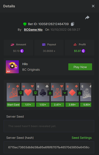 $2.5k Prestige Hilo Challenge #50 Starts: 10, October 6:00pm GMT Ends: 17, October 6:00pm GMT Hey Everybody! This week's prestige event is open to all VIP players and is giving away $2,500 in prizes. The Top 10 will win the major prize and the remaining $700 will be split between everyone else. And it doesn't stop there, any player who completes the extra bounty will receive an equal share of the $500 prize pool. Looking for a fun and challenging way to earn some extra BCD coins? Try your hand at Hilo. – (details further down). What's the Challenge? Win the highest multiplier you can on on BC.Game's in-house game, Hilo (Skipping is allowed). If there is a tie, the player with the higher average bet amount (in USD) shall be the winner. If there is a tie in the amount and payout, the one who posted or edited his post first will be considered in the Ranking. Minimum VIP There's no minimum VIP level Minimum Payouts Minimum payout to qualify is 30x Minimum Bet Size $0.15 USD equivalent Eligible Coins All cryptocurrencies are eligible (excepting JB) Available Prizes 1st Place....... $500 2nd Place..... $300 3rd Place...... $200 4th Place......$100 5th Place......$50 6th-10th.........$30 All other participants.........$700 Bounty Prize...$500, equal share. EXTRA BOUNTY Share a winning bet by exactly opening 3 cards KKK or AAA. The bet must be a winning bet. How to Enter To enter, copy the link of the bet you'd like to submit. Once you've copied it, paste it as a reply to this thread like so: Link: https://bc.game/#/sd/10UREKJY09HO9F In the same post, upload a screenshot of your win by clicking the game ID WITH VIEW IN USD mode ENABLED (accessible at the bottom of dropdown menu for your wallet up top. This way, we can ensure that your bet indeed met the minimum requirement at the time of placing it: Link: https://bc.game/#/sd/10UREKJY09HO9F Please combine all of your hits together in a SINGLE post. Edit your existing post for additional hits, don't create a new post. Each eligible entry must have the Bet Slip URL, failure to include it will disqualify participation in the event. Bet Slip image is not mandatory. Bets must be posted within 24 hours of placing bet in order to keep things fair for everyone. Bets must be made during the specified time window stated above. This thread will lock automatically when the time period is over. One (1) entry per household. Anyone found attempting to win multiple prizes will be disqualified from this challenge as well as all future challenges. Failure to follow instructions will result in your submission being null and void. By entering this challenge, you acknowledge that BC.Game has the final decision on results and placement. Payouts will be distributed after the event is finished. Please note that it could take anywhere between 24 hours to 7 days after the completion of the event. Good luck everyone!