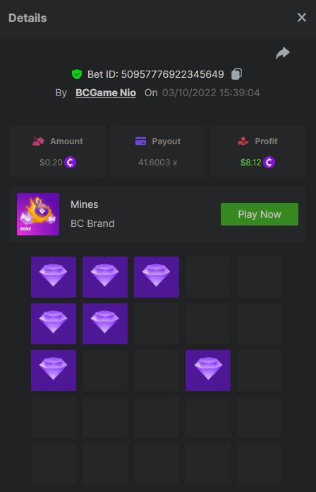 $2.5k Prestige Mines Challenge #49 Starts: 03, October 7:30pm GMT Ends: 10, October 7:30pm GMT Hey Everyone! Our weekly event returns to all VIPs again, we are giving away $2,500 in prizes from our Prestige challenge. The Top 10 will take home a major prize, and the remaining $700 will be split between all other participants. Additionally, any player who completes the extra bounty will receive an equal share of the $500 prize pool. So head over to the Mines game page and get started! – (Check all the conditions of participation below). What's the Challenge? Win the highest multiplier you can on on BC.Game's in-house game, Mines. If there is a tie, the player with the higher average bet amount (in USD) shall be the winner. If there is a tie in the amount and payout, the one who posted or edited his post first will be considered in the Ranking. Minimum VIP There's no minimum VIP level Minimum Payouts Minimum payout to qualify is 20x Minimum Bet Size $0.15 USD equivalent Eligible Coins All cryptocurrencies are eligible (excepting JB) Available Prizes 1st Place....... $500 2nd Place..... $300 3rd Place...... $200 4th Place......$100 5th Place......$50 6th-10th.........$30 All other participants.........$700 Bounty Prize...$500, equal share. EXTRA BOUNTY Share a winning bet with 15 mines - 5 diamonds (208.73x) and receive an equal share of the $500 prize pool! Original rules apply with min bet, minimum VIP. How to Enter To enter, copy the link of the bet you'd like to submit. Once you've copied it, paste it as a reply to this thread like so: Link: https://bc.game/#/sd/10UAQQA0JK2Z9V In the same post, upload a screenshot of your win by clicking the game ID WITH VIEW IN USD mode ENABLED (accessible at the bottom of dropdown menu for your wallet up top. This way, we can ensure that your bet indeed met the minimum requirement at the time of placing it: Link: https://bc.game/#/sd/10UAQQA0JK2Z9V Please combine all of your hits together in a SINGLE post. Edit your existing post for additional hits, don't create a new post. Each eligible entry must have the Bet Slip URL, failure to include it will disqualify participation in the event. Bet Slip image is not mandatory. Bets must be posted within 24 hours of placing bet in order to keep things fair for everyone. Bets must be made during the specified time window stated above. This thread will lock automatically when the time period is over. One (1) entry per household. Anyone found attempting to win multiple prizes will be disqualified from this challenge as well as all future challenges. Failure to follow instructions will result in your submission being null and void. By entering this challenge, you acknowledge that BC.Game has the final decision on results and placement. Payouts will be distributed after the event is finished. Please note that it could take anywhere between 24 hours to 7 days after the completion of the event. Good luck everyone!