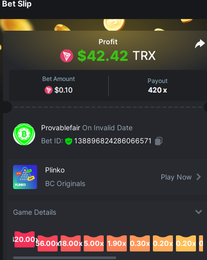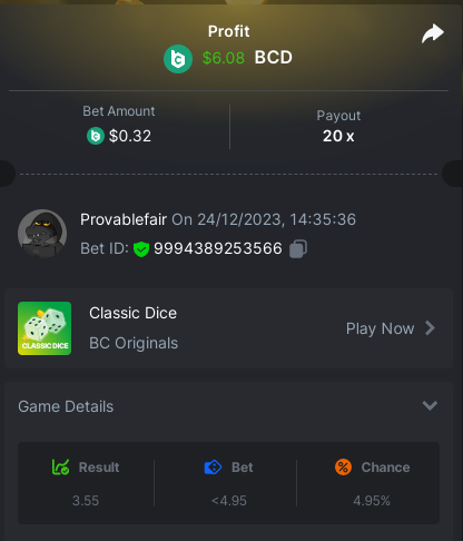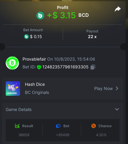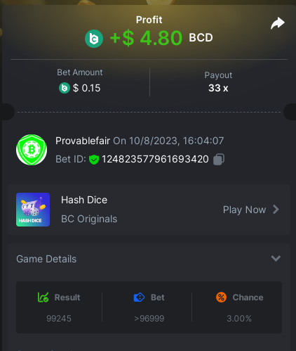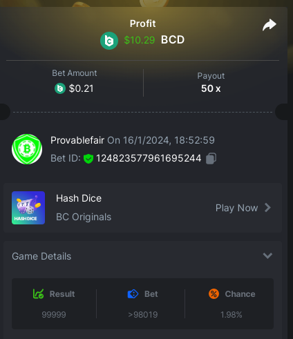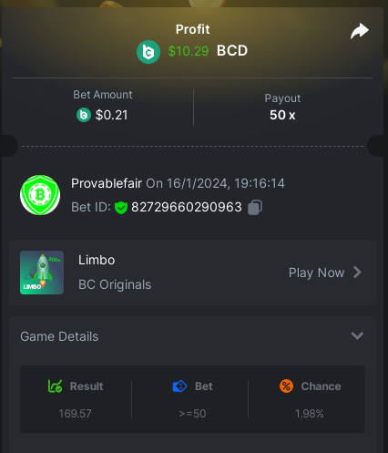 4. bet 0.21$ - 50x - Hash Dice - https://bc.game/#/sd/11QN6R5L1JDVQJ - Bet ID: 124823577961695244 bet 0.21$ - 50x - Limbo - https://bc.game/#/sd/11QN8527NJ49ZV - Bet ID: 82729660290963