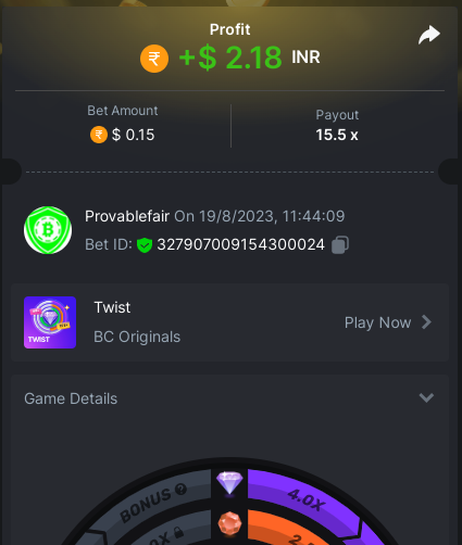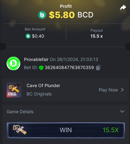 3. 0.4$ - 15.5x - https://bc.game/#/sd/11RH591NALD6X7 - Bet ID: 362640847763670359