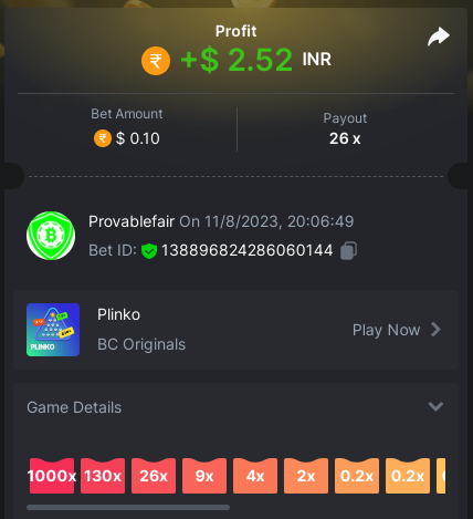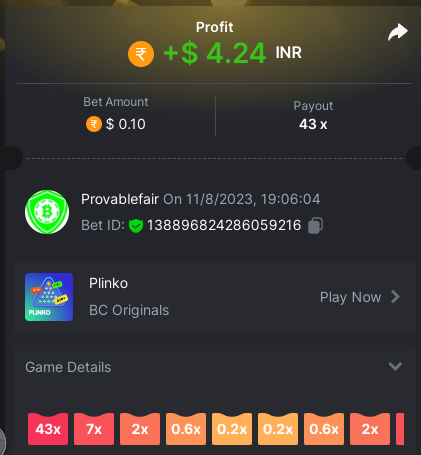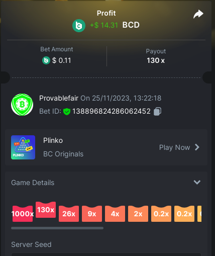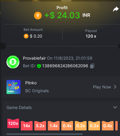 5. 20x - bet amount:0.32$ - Bet id: 9994389253566 - Bet link: https://bc.game/#/sd/11P1R1UXL5GQ4N
