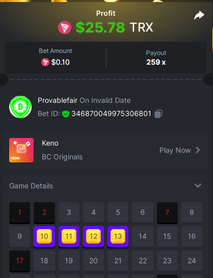 1. task done 17 out of 30 points Easy 1. Win a Crash bet with a 10x payout. Bet Amount 0.2$ - payout 10x - https://bc.game/#/sd/11W05LAVJ0XRDV - betid 1795325633233020674 2. Get a 10x payout on a Classic Dice bet. Bet amount 0.1$ - Bet ID: 9994389254345 - https://bc.game/#/sd/11W04DAUSPUQLN 3. Get a 10x payout on the Run Away Zumbies. Bet Amount 0.2$ - Payout 80.3106 x - https://bc.game/#/sd/11W0KIE8VXJPMF - Bet ID:1795339805452732712 4. Win a 'Tie' 9x bet on the Baccarat. - bet 0.12$ - https://bc.game/#/sd/11VZYA5O9WTSHN - Bet Id 443334654666211352 5. Get a 20x payout on the John Wild. Bet amount 0.1$ - payout 20.902x - https://bc.game/#/sd/11W0GYKZI9NE6F - Bet ID:1795337202902585386 6. Win a Twist bet on 15.5x payout (3rd Purple Gem). bet 0.1$- 15.5x - https://bc.game/#/sd/11W00W2HE7XUUZ - betid 443343283255509488 7. Win a Sports bet with minimum odds being 1.5x (singles only) 2$ base min amount. Ticket Id 2386880115666727018 - odds 1.871x bet 100 tron (11$+) - 8. Get a minimum 20x multi on BGaming Hello Easter slot. Bet Amount 0.18$ - Payout 22.2271 x - https://bc.game/#/sd/11W0M2A9IMSF3V - Bet ID:1795342327546256169 9. Get a minimum 30x multi on Red Tiger Lucky Easter slot. Bet Amount 0.1$ - Payout 103.7037 x-https://bc.game/#/sd/11W0T1253QL30F - Bet ID: 1795349432350376490 10. 2FA enabled , E-Mail & Phone Number verified. Medium 1. Win a bet in Roulette Single with betting on 0 only (36x). (no spread bets) Bet Amount 0.1$ - payout 36x - https://bc.game/#/sd/11W0G3KI2UCN0B - Bet ID:160147613797056952 2. Get a 76x on Plinko. Bet Amount 0.1$ - Payout 76x -https://bc.game/#/sd/11W0FBW34H0ZNF - Bet ID:138896824286067710 4 Win a Sports bet with minimum odds of 2x (singles only) 2$ base min amount. Ticket Id 2386880698159079982 - odds 2.21x bet 45 tron (5$+) - 8. Get a minimum 90x multi on BGaming Easter Heist slot. Bet Amount $0.10 - Payout 136.1364x - https://bc.game/#/sd/11W2937HDYZ1R7- Bet ID:1795402318880305961 Hard 1. Get a 29.70x on Wheel (30 segments, High risk). Bet Amount 0.1$ - Payout 29.7x - https://bc.game/#/sd/11W01J42QJW7EV Bet ID: 443346852373331982 2. Get a 420x on Plinko (14 rows, High risk). Bet Amount 0.1$ - Payout 420x - https://bc.game/#/sd/11W0CA75CTHUGR - Bet ID: 138896824286066571 7. Win a bet on Keno Single by selecting numbers 10, 11, 12 and 13, High risk, (259.00x). Bet Amount 0.1$ - payout 259x - https://bc.game/#/sd/11W08UETLZH4BV - BetID :346870049975306801