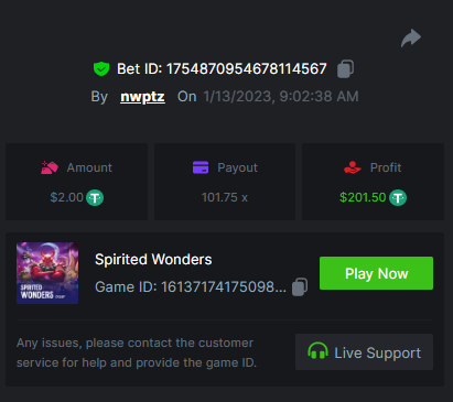 1. 1. Prosperity Fortune Tree Bet ID: https://bc.game/#/sd/111BVADCIO2BKJ Screenshot: 2. Butterfly Blossom Bet ID: https://bc.game/#/sd/1119N7L5NRG36B Screenshot: 3. Legendary Monkey King Bet ID: https://bc.game/#/sd/1115UPO0WYUDQR Screenshot: 4, Spirited Wonders Bet ID: https://bc.game/#/sd/1119O9DKLIR5EB Screenshot: 5. Supermarket Spree Bet ID: https://bc.game/#/sd/1119PMTXCPKV0Z Screenshot: 6. Candy Bonanza Bet ID: https://bc.game/#/sd/111CCUMEY4EDCJ Screenshot: 7. Destiny of Sun & Moon Bet ID: https://bc.game/#/sd/1119US1SLHM1OZ Screenshot: 8. Leprechaun Riches Bet ID: https://bc.game/#/sd/111C1ZDGLO4843 Screenshot: 9. Wild Bandito Bet ID: https://bc.game/#/sd/111662VB4AX7GZ Screenshot: 10. Wild Bounty Showdown Bet ID: https://bc.game/#/sd/1119STIAQVERKJ Screenshot: