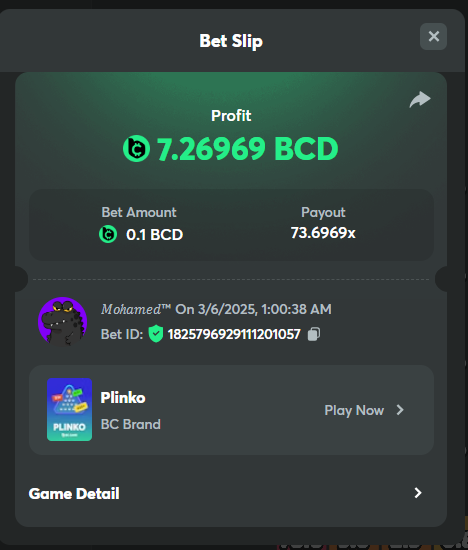 3-Get a payout of 73.6x on the original Plinko game Risk-High, Row-10.