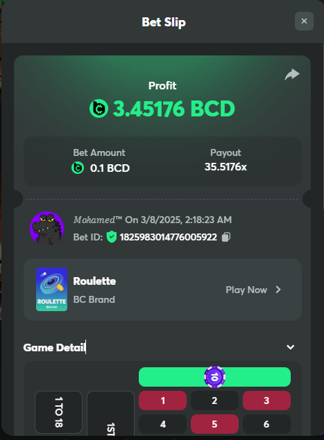 4-BC original Roulette Single game Win 36x on the on number 0.