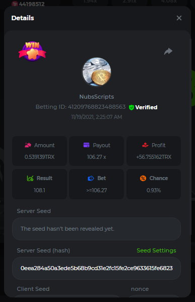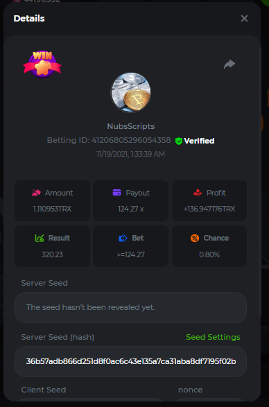 The get history has always loaded the previous 20 rolls. The only way to load more is to get from verification site which is beyond me. It grabs those 20 previous rolls because that's 20 more than just pressing Start and we want to see some sort of pattern before betting. It now adjusts the bet according to losses. The Update won't show correct Profit as the ability to call the currency.amount returns the same amount as when the script 1st started. To me this is old and spaghetti looking with crap all over it. This style of betting based upon losses generates a certain level of profit, but is not even close to basing bets on the Streaks % and pausing betting when no streaks. //******************* Nubs27's Smart Script for Crash ******************* // // // // If you find this script helpful please consider donating to Nubs27 or tipping on NanoGames.io: // Referral Link: https://n-luzqe.nanogames.io/ // // Donations accepted in many coin/token types. List & Addresses: // https://sites.google.com/view/nanogamescrashscripts/home/donation-addresses // // // var config = { mainTitle: { label: '*** Nubs27\'s Smart Script for Crash ***', type: 'title' }, auto: { label: '', value: 'Script', type: 'radio', options: [ { value: 'Script', label: 'Script chooses Base Bet'}, { value: 'Player', label: 'Player chooses Base Bet'} ]}, bet: { label: 'Base Bet', value: currency.minAmount, type: 'number' }, lossTitle: { label: 'Stop When ', type: 'title' }, stop: { label: 'Coins Lost >', value: 1, type: 'number' }, end: { label: 'Minutes >', value: 250, type: 'number' }, profit: { label: 'Profit >', value: 100, type: 'number' }, }; function main () { //PayOuts checked in the Stats Update const MultiplierArray = [2.5, 3.00, 5.00, 6.00, 7.00]; const LMultiplierArray = [10.00, 20.00, 50.00, 100.00]; var version = "v2.3"; var PayOutPercents = []; var PayOutConfidence = []; var Array2Filter = []; var FilteredArray = []; var ScriptHistory = []; var Trains = []; // Red Train IDs - finding gaps between & correlation between gap & duration var History = []; var RoundsPlayed = 0; var RoundsViewed = 0; var LastGameID = 1; var CurrentGameID = LastGameID + 1; var MinimumBet = currency.minAmount; var MaxBet = (currency.amount / 10); var TotalBets = 0; var CurrentMultiplier = MultiplierArray[1]; var LastMultiplier = MultiplierArray[1]; var MaxLossesEncountered = 3; var MostLost = 0; var LargestMulitplier = 2; var BaseBet = config.bet.value; var CurrentBet = BaseBet; var LastBet = BaseBet; var LastShrek = CurrentGameID; var LastTrain = 0; var Gap = 0; var AverageGap = 0; var LargestBet = [0,0]; var Enable100ID = 1000000; var LastResult = "Won"; var CoinLost = 0; var StopLossCoin = config.stop.value; var Losses = 0; var Wins = 0; var Red = 0; var Green = 0; var StartTime = new Date(); var EndTime = new Date(); var TimeDiff = (EndTime - StartTime); var StartBalance = currency.amount; var EndBalance = 0; var Profit = 0; var ATHProfit = 0; var ProfPerMin = 0; var NetProfit = 0; var DisplayGreeting = "False"; var GotHistory = "False"; var BetYet = "False"; var LoggedBetData = "False"; var GameInfoLogged = "False"; var StrategyFound = "False"; var IsPlaying = "False"; var UpdateBets = "False"; var Enable100 = "False"; var LastCrash = 0; var PrevCashOut = 0; var WonAmount = 0; var FindThisMultiplier = 1; var FindShouldHave = 2; var ThisAverage = 1; var HistorySlice = 50; var Paused = "True"; var IndexMax = PayOutConfidence[0]; var MaxIndex = 0; var GetNumber = 0; // Welcome the Player to the Script console.clear(); engine.on('GAME_STARTING', function () { if (DisplayGreeting == "False") { log.info(' Nubs27s Smart Script for Crash'); log.info(" ****************"); log.info("See Web Console for more Information (Press F12)"); console.log('%c~~~~~~~~~~~~~~~~~ Nubs27\'s Smart Script for Crash ~~~~~~~~~~~~~~~~~','color:Purple; font-weight:bold'); console.log('%cScript Start Time: ' + StartTime,'color:Purple; font-weight:200'); console.log(' %cWelcome ' , 'color:Purple; font-weight:bold'); console.log(' %cYour Starting Balance is: ' + StartBalance + ' ' + currency.currencyName, 'color:Purple; font-weight:bold'); if (config.auto.value == 'Player') { if (config.stop.value > currency.amount) { MaxBet = (currency.amount / 10); config.stop.value = currency.amount * 0.98; console.log('%c[WARNING]: Stop Loss is above your Bankroll','color:Orange; font-weight:bold'); console.log('%c[WARNING]: Stop Loss Updated to ' + config.stop.value, 'color:Orange; font-weight:bold'); } if (config.bet.value > (config.stop.value / 15000)) { log.info('[WARNING]: Script Recommends a bankroll of at least ' + (BaseBet * 15000) + '' + currency.currencyName + ' for the Base Bet you provided'); log.info('[WARNING]: Script Recommends a bankroll of at least ' + (BaseBet * 20000) + '' + currency.currencyName + ' for the Base Bet you provided'); log.info('[WARNING]: Script Recommends a bankroll of at least ' + (BaseBet * 25000) + '' + currency.currencyName + ' for the Base Bet you provided'); } console.log(' %cYou Input: ' + BaseBet + ' ' + currency.currencyName + ' as the Base Bet', 'color:Purple; font-weight:bold'); }else{ betupdate(); console.log(' %cYour Starting Base Bet is: ' + BaseBet + ' ' + currency.currencyName, 'color:Purple; font-weight:bold'); } console.log(' %cYour Stoppers are: Coin Lost > ' + config.stop.value + '; Minutes > ' + config.end.value + '; Profit > ' + config.profit.value, 'color:Purple; font-weight:bold'); console.log('%c~~~~~~~~~~~~~~~~~~~~~~~~~~~~~~~~~~~~~~~~~~~~~~~~~~~~~~~~~~~~~~~~~~','color:Purple; font-weight:bold'); if (config.stop.value > currency.amount) { MaxBet = (currency.amount / 10); config.stop.value = currency.amount * 0.95; console.log('%c[WARNING]: Stop Loss Updated to ' + config.stop.value, 'color:Orange; font-weight:bold'); } } DisplayGreeting = "True"; if (GotHistory == "False") { getnanohistory(); GotHistory = "True"; console.log(ScriptHistory); LastShrek = []; LastTrain = []; } // // // //Everything above here only runs 1