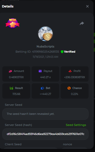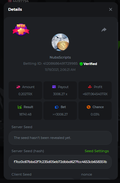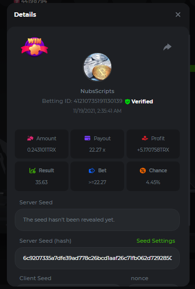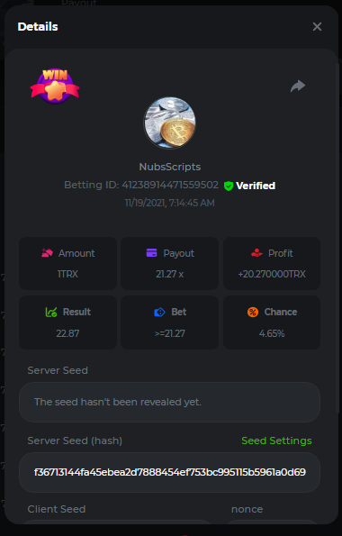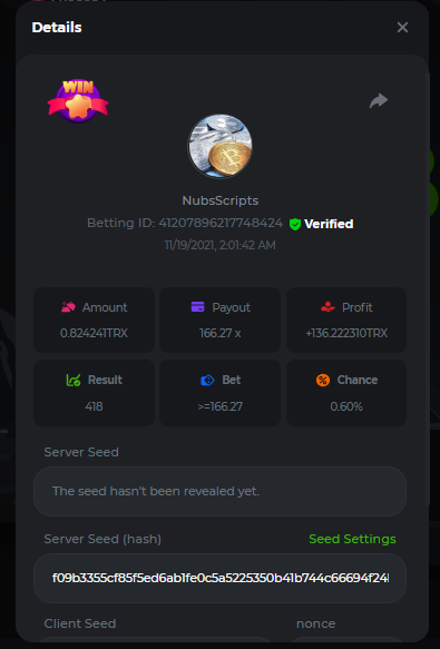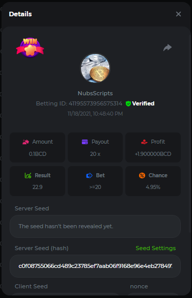 Yes this thread is a little old but hopefully you all are still around. I'm going to post a script from 3 years ago. I'm pretty sure the responses from server have changed so it won't run. However, this script will change the payout based upon the board. At one point it ran on ng for almost 30 days straight without interruption. Documented and posted screenshots along the way. Started with free 0.005 Eth from spider back then and got it up to 0.89 Eth and then I got scared and shut it down. //******************* Nubs27's Smart Script for Crash ******************* // // // // If you find this script helpful please consider donating to Nubs27 or tipping on NanoGames.io: // Referral Link: https://n-luzqe.nanogames.io/ // // Donations accepted in many coin/token types. List & Addresses: // https://sites.google.com/view/nanogamescrashscripts/home/donation-addresses // // // var config = { mainTitle: { label: '*** Nubs27\'s Smart Script for Crash ***', type: 'title' }, auto: { label: '', value: 'Script', type: 'radio', options: [ { value: 'Script', label: 'Script chooses Base Bet'}, { value: 'Player', label: 'Player chooses Base Bet'} ]}, bet: { label: 'Base Bet', value: currency.minAmount, type: 'number' }, lossTitle: { label: 'Stop When ', type: 'title' }, stop: { label: 'Coins Lost >', value: 1, type: 'number' }, end: { label: 'Minutes >', value: 250, type: 'number' }, profit: { label: 'Profit >', value: 100, type: 'number' }, }; function main () { //PayOuts checked in the Stats Update const MultiplierArray = [2.5, 3.00, 5.00, 6.00, 7.00]; const LMultiplierArray = [10.00, 20.00, 50.00, 100.00]; var version = "v2.3"; var PayOutPercents = []; var PayOutConfidence = []; var Array2Filter = []; var FilteredArray = []; var ScriptHistory = []; var Trains = []; // Red Train IDs - finding gaps between & correlation between gap & duration var History = []; var RoundsPlayed = 0; var RoundsViewed = 0; var LastGameID = 1; var CurrentGameID = LastGameID + 1; var MinimumBet = currency.minAmount; var MaxBet = (currency.amount / 10); var TotalBets = 0; var CurrentMultiplier = MultiplierArray[1]; var LastMultiplier = MultiplierArray[1]; var MaxLossesEncountered = 3; var MostLost = 0; var LargestMulitplier = 2; var BaseBet = config.bet.value; var CurrentBet = BaseBet; var LastBet = BaseBet; var LastShrek = CurrentGameID; var LastTrain = 0; var Gap = 0; var AverageGap = 0; var LargestBet = [0,0]; var Enable100ID = 1000000; var LastResult = "Won"; var CoinLost = 0; var StopLossCoin = config.stop.value; var Losses = 0; var Wins = 0; var Red = 0; var Green = 0; var StartTime = new Date(); var EndTime = new Date(); var TimeDiff = (EndTime - StartTime); var StartBalance = currency.amount; var EndBalance = 0; var Profit = 0; var ATHProfit = 0; var ProfPerMin = 0; var NetProfit = 0; var DisplayGreeting = "False"; var GotHistory = "False"; var BetYet = "False"; var LoggedBetData = "False"; var GameInfoLogged = "False"; var StrategyFound = "False"; var IsPlaying = "False"; var UpdateBets = "False"; var Enable100 = "False"; var LastCrash = 0; var PrevCashOut = 0; var WonAmount = 0; var FindThisMultiplier = 1; var FindShouldHave = 2; var ThisAverage = 1; var HistorySlice = 50; var Paused = "True"; var IndexMax = PayOutConfidence[0]; var MaxIndex = 0; var GetNumber = 0; // Welcome the Player to the Script console.clear(); engine.on('GAME_STARTING', function () { if (DisplayGreeting == "False") { log.info(' Nubs27s Smart Script for Crash'); log.info(" ****************"); log.info("See Web Console for more Information (Press F12)"); console.log('%c~~~~~~~~~~~~~~~~~ Nubs27\'s Smart Script for Crash ~~~~~~~~~~~~~~~~~','color:Purple; font-weight:bold'); console.log('%cScript Start Time: ' + StartTime,'color:Purple; font-weight:200'); console.log(' %cWelcome ' , 'color:Purple; font-weight:bold'); console.log(' %cYour Starting Balance is: ' + StartBalance + ' ' + currency.currencyName, 'color:Purple; font-weight:bold'); if (config.auto.value == 'Player') { if (config.stop.value > currency.amount) { MaxBet = (currency.amount / 10); config.stop.value = currency.amount * 0.98; console.log('%c[WARNING]: Stop Loss is above your Bankroll','color:Orange; font-weight:bold'); console.log('%c[WARNING]: Stop Loss Updated to ' + config.stop.value, 'color:Orange; font-weight:bold'); } if (config.bet.value > (config.stop.value / 15000)) { log.info('[WARNING]: Script Recommends a bankroll of at least ' + (BaseBet * 15000) + '' + currency.currencyName + ' for the Base Bet you provided'); log.info('[WARNING]: Script Recommends a bankroll of at least ' + (BaseBet * 20000) + '' + currency.currencyName + ' for the Base Bet you provided'); log.info('[WARNING]: Script Recommends a bankroll of at least ' + (BaseBet * 25000) + '' + currency.currencyName + ' for the Base Bet you provided'); } console.log(' %cYou Input: ' + BaseBet + ' ' + currency.currencyName + ' as the Base Bet', 'color:Purple; font-weight:bold'); }else{ betupdate(); console.log(' %cYour Starting Base Bet is: ' + BaseBet + ' ' + currency.currencyName, 'color:Purple; font-weight:bold'); } console.log(' %cYour Stoppers are: Coin Lost > ' + config.stop.value + '; Minutes > ' + config.end.value + '; Profit > ' + config.profit.value, 'color:Purple; font-weight:bold'); console.log('%c~~~~~~~~~~~~~~~~~~~~~~~~~~~~~~~~~~~~~~~~~~~~~~~~~~~~~~~~~~~~~~~~~~','color:Purple; font-weight:bold'); if (config.stop.value > currency.amount) { MaxBet = (currency.amount / 10); config.stop.value = currency.amount * 0.95; console.log('%c[WARNING]: Stop Loss Updated to ' + config.stop.value, 'color:Orange; font-weight:bold'); } } DisplayGreeting = "True"; if (GotHistory == "False") { getnanohistory(); GotHistory = "True"; console.log(ScriptHistory); LastShrek = []; LastTrain = []; } // // // //Everything above here only runs 1 time console.log(' ----------------------------'); CurrentGameID = (LastGameID + 1); console.log('[Round ID]: ' + CurrentGameID); if (StrategyFound == "False") { strategy(); } //Checks Us