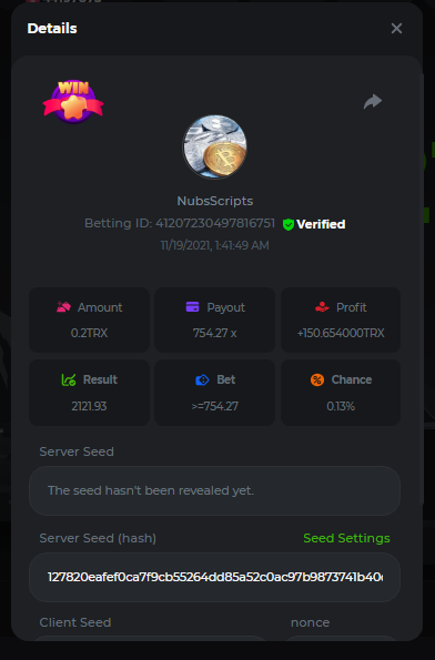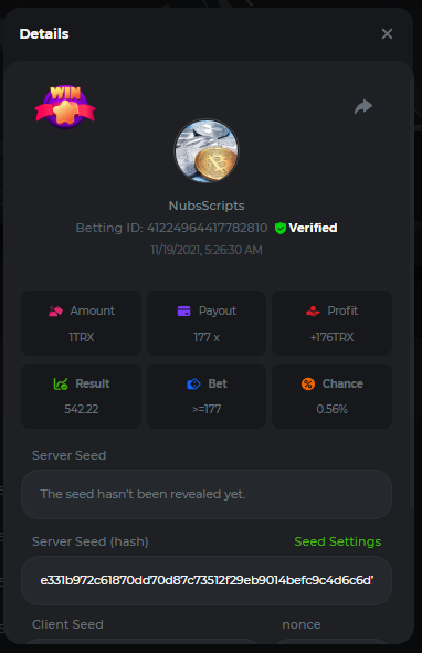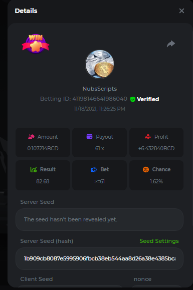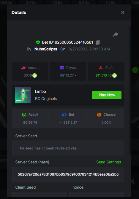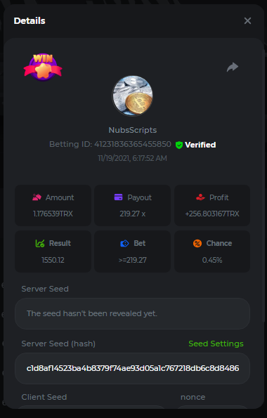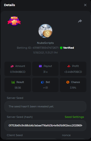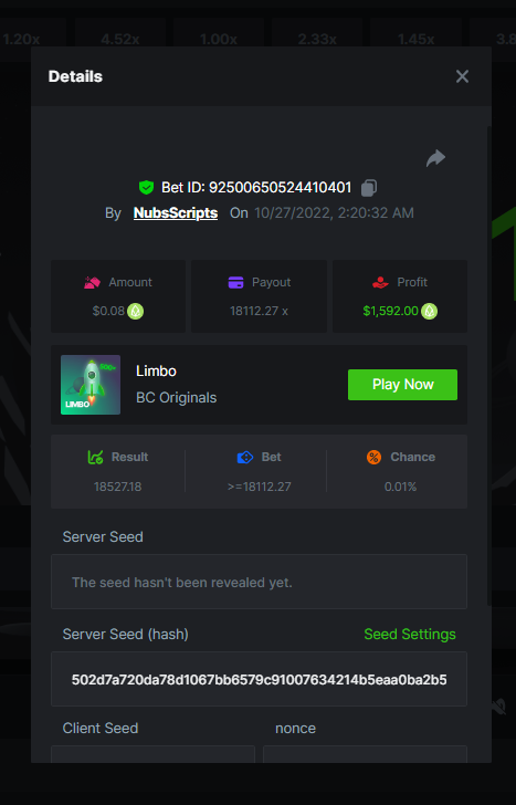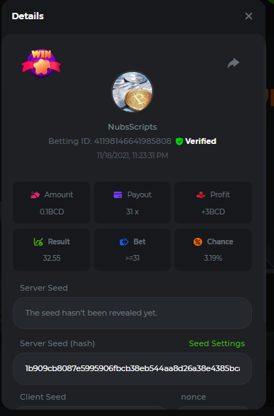 Thanks Skele, Yes, Cryptorichi that was the last version of the script I did. I now play manually with Hash Dice or Limbo. That script is based upon the losses you have incurred so far. It doesn't anticipate anything. Therefore, there will come a time when the gap between wins will be too great to overcome. By grabbing the last 2k rounds, I should be able to incorporate the Deep Learning api into it. Although it wouldn't be perfect it would return better results than the v2.3. We used to do it with Hash Dice until the game engine changed. Crash is really slow, I used to only play Crash, but now I rarely do. 14k rounds in a day for Crash compared to 100k rolls for Limbo/Hash Dice.