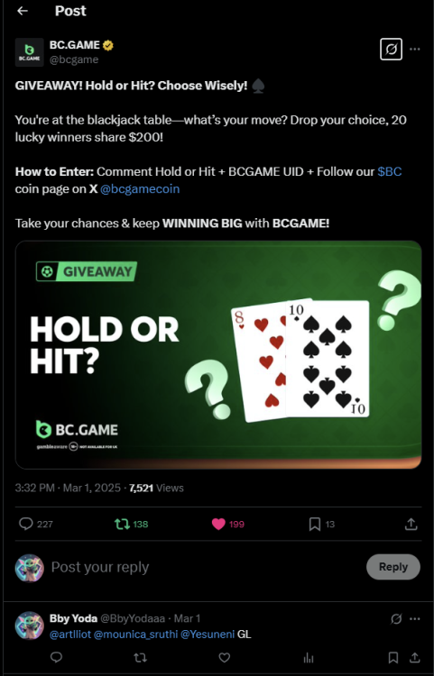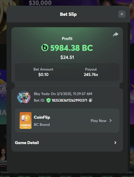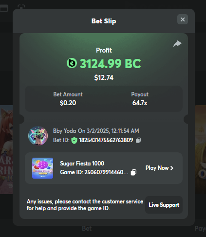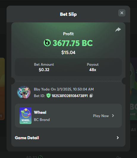 3. HARD 1. Win on Wheel 48x or higher - Row 50, Segment High. https://bc.game/game-detail/1825381028108473891 2. Score 100x or higher in the Crash game. https://bc.game/game-detail/1825382938224318851 3. Win CoinFlip game 200x or higher multiplier. https://bc.game/game-detail/1825383611262990371 4. Stellar Rush get 200x or higher in the game. https://bc.game/game-detail/1825399678713421346 5. Plinko win 252x or higher in Row 14, High Risk. https://bc.game/game-detail/1825381945963958049 6. Limbo game is your target to win 200x or higher. https://bc.game/game-detail/1825393935175424545 7. Get 200x or higher in the Hash Dice game. https://bc.game/game-detail/1825394623162498081 8. BC Originals Slot Sea Of Olympus 1000 score a win 100x or higher. https://bc.game/game-detail/1825945368781779235 9. BC Originals Slot Gold of Olympus score a win 100x or higher. 10. Get 90x or higher in the Duck Hunter slot game from NoLimitCity. https://bc.game/game-detail/1825405508850703649 11. Win a 10x+ payout on a Sports parlay/combo bet should consist on 3+ matches to qualify! Bet Id: 2512790685074207035 Medium 1. Deposit At least $100 USD 2. Get 50x in the Crash game. https://bc.game/game-detail/1825947633929377670 3. Get a payout of 73.6x on the original Plinko game Risk-High, Row-10 https://bc.game/game-detail/1825941318525539619 4. BC original Roulette Single game Win 36x on the on number 0. https://bc.game/game-detail/1825424891044944674 5. Get 50x in the BC original Starshine Princess 1000 slot game. https://bc.game/game-detail/1825941998974470178 6. BC original Stellar Rush game Win 50x in the. https://bc.game/game-detail/1825433104756547362 7. Win a 96.96x Keno bet by selecting numbers 1, 14, 22, 28 (Risk: Medium). https://bc.game/game-detail/1825424463452185121 8. Get 50x in the Poker Ways slot game. https://bc.game/game-detail/1825942652878339106 9. BC original Wukong slot game get 50x multi. 10. Buy at least 30 BC Lottery tickets using $BC Token. -or- Buy at least 2 BC Porsche lottery tickets using $BC Token send screenshot in forum post. 11. Win a sports parlay/combo bet with at least 3 matches and a 2.5x minimum payout to qualify. bet id : 2507603194100719962 Easy 1. Deposit at least $50 USD 2. Follow BC.GAME on Instagram, take a screenshot, and share it with your IG username in the forum! IG: @vladpkr 3. Share a BC.Game photo or video on your Instagram, tag us #bcgame, and drop the link with your IG username in the forum! IG: @vladpkr https://www.instagram.com/p/DGrB1nmt7gafOh4ZPSw5GmmtpAID6tAbWCXfQo0/ 4. Follow BC.GAME Twitter Take a screenshot of the following and include your Twitter username in the forum. Twitter : @BbyYodaaa 5. Like and Retweet BC.GAME's latest post and tag at least 3 of your friends. Take a screenshot and include your Twitter username in the forum. Twitter : @BbyYodaaa 6. Follow BC.GAME Facebook. Take a screenshot of the following and include your FB username in the forum. FB username : https://www.facebook.com/ciucalete.florinel 7. Win a payout of 20x on the original Limbo game. https://bc.game/game-detail/1825430223659262499 8. Win a Sports bet with a minimum payout of 1.5x odds (Only for single bets). Bet ID: 2507756112523174597 9. Get a 20x multi in the Arabian Secret slot game. https://bc.game/game-detail/1825431774221836065 10. Get a 30x multi in the Sugar Fiesta 1000 slot game. https://bc.game/game-detail/1825431475562763809 11. Activate 2FA security on your BC.Game account. Take a screenshot of 2FA and keep it active till the result is announced.