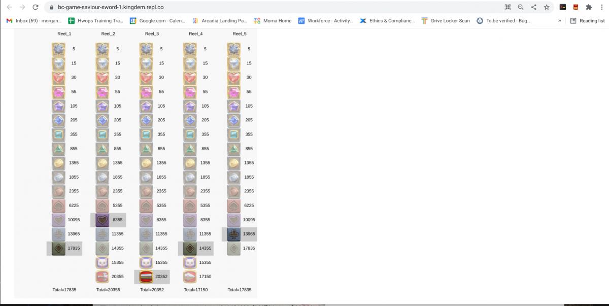 7. const SLOT_TABLE = { 1: { Cloth: 5, Charcoal: 5, Sulfur: 5, Gunpowder: 4, "High Quality Metal": 3, Saloon: 1 }, 2: { Cloth: 6, Charcoal: 6, Sulfur: 6, Gunpowder: 3, "High Quality Metal": 1, Saloon: 1 }, 3: { Cloth: 6, Charcoal: 6, Sulfur: 6, Gunpowder: 3, "High Quality Metal": 1, Saloon: 1 } }; const SLOTS = { 1: [], 2: [], 3: [] } The Saloon would be your special bonus element and What needs to happen I think is add 5 more elements on each reel and change the 10 element (saloon) which is correctly identified as special. As yoh said nit much we can verify with out proper source.