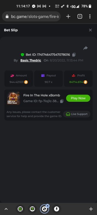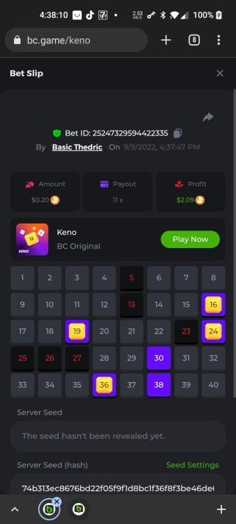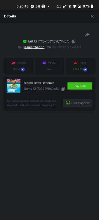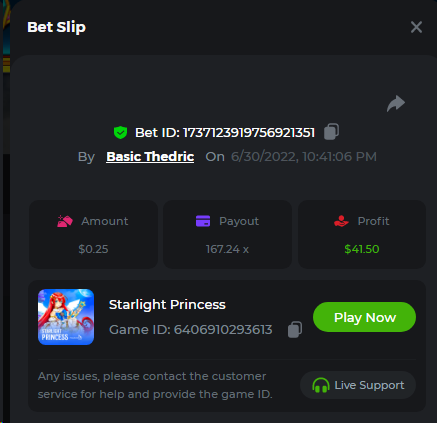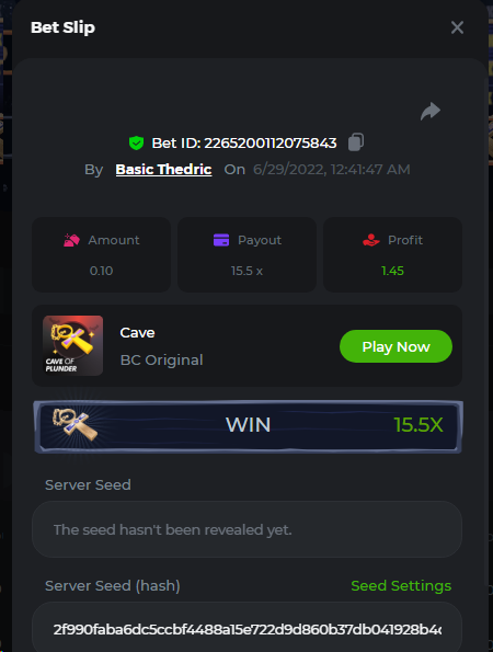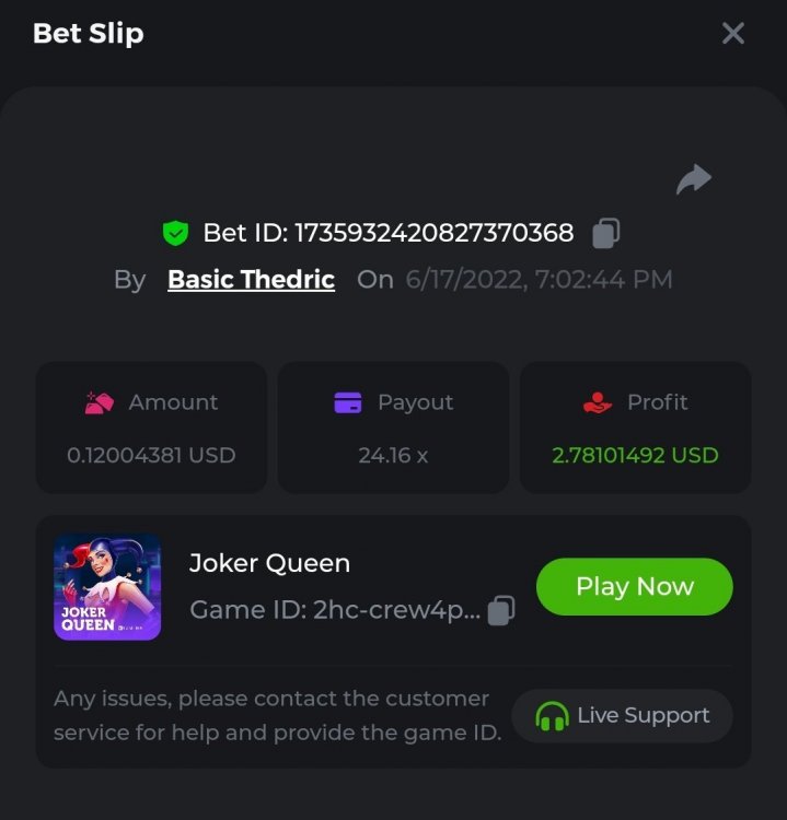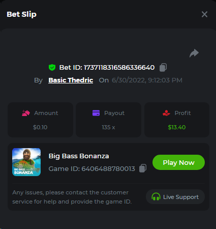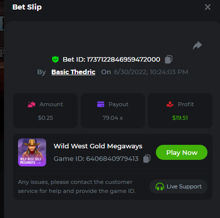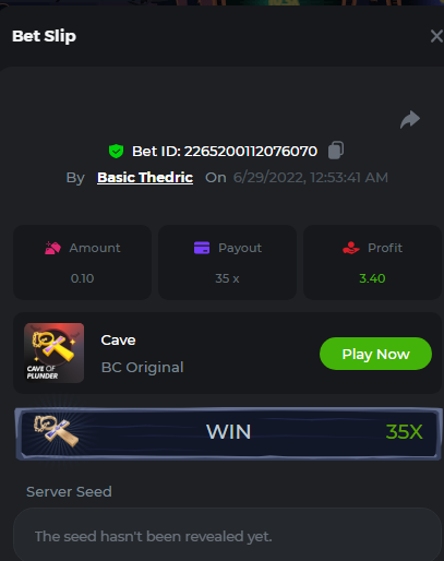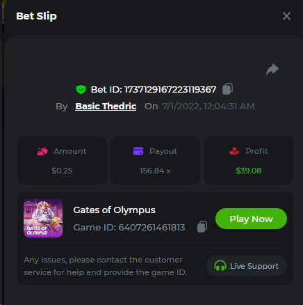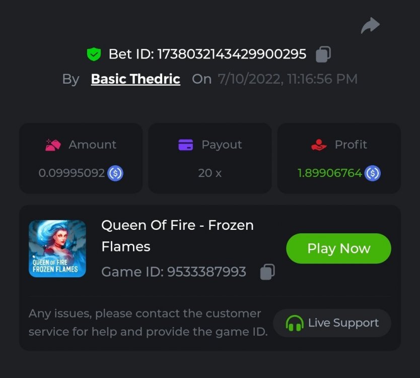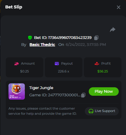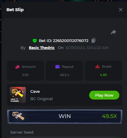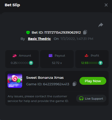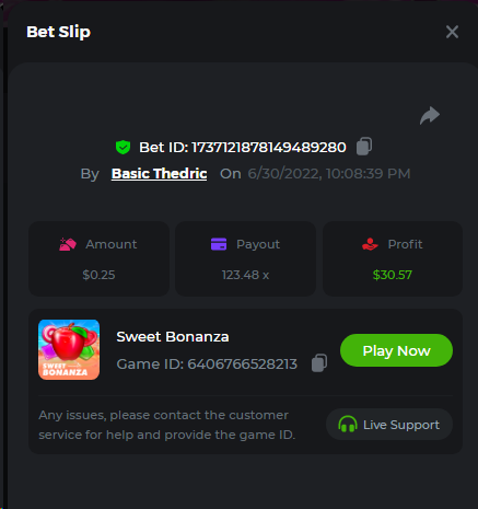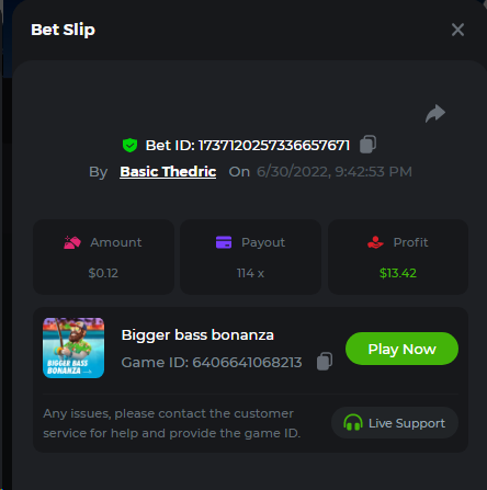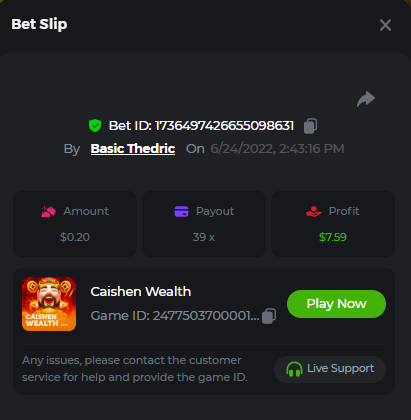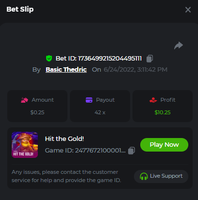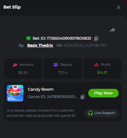 Multiplier: 100X Bet: $0.4096 Bounty: Yes Glad this didn't take too long. I'm not a fan of this game. IMO the bounty is silly for this one. Too easy. As can be seen by how many ppl on page 1 alone got it. Just my $.02 https://bc.game/sd/?sd=10TEPGQMJ45HCJ And the bounty https://bc.game/sd/?sd=10TEOAK0JLFOCZ -