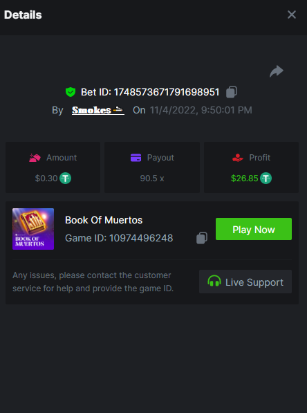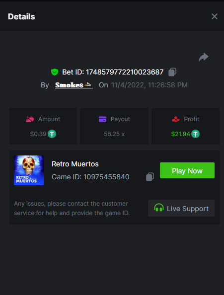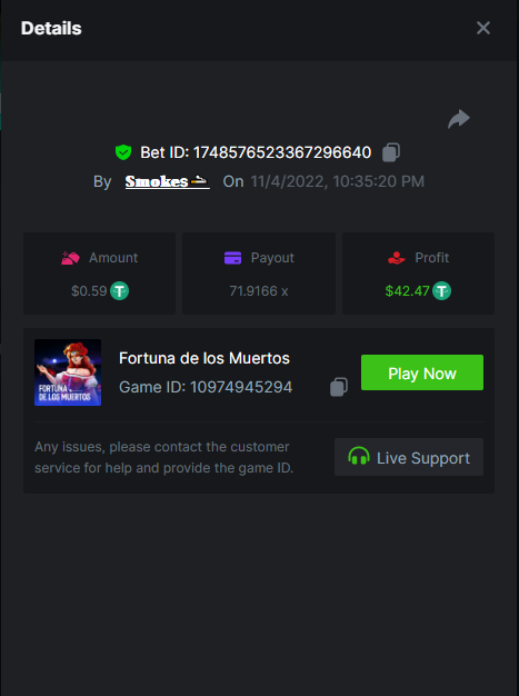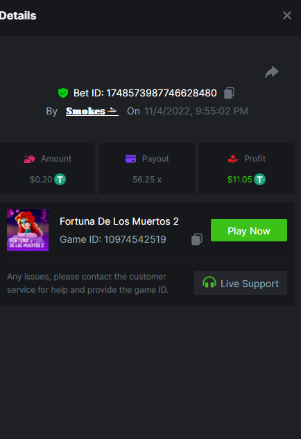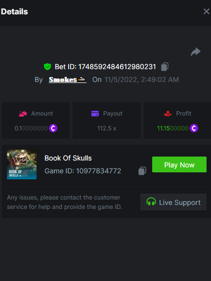 https://bc.game/#/sd/10WHY7B9FGP89F Book of skull - 112.5x https://bc.game/#/sd/10WHLO1SRXGHSJ retro muertos 56.25x https://bc.game/#/sd/10WHIH15IDYJ2R Fortuna de los Muertos 71.9166x https://bc.game/#/sd/10WHFZWDV94ZRN Fortuna De Los Muertos 2 - 56.25x https://bc.game/#/sd/10WHFO52879BMB Book of Muertos 90.5x