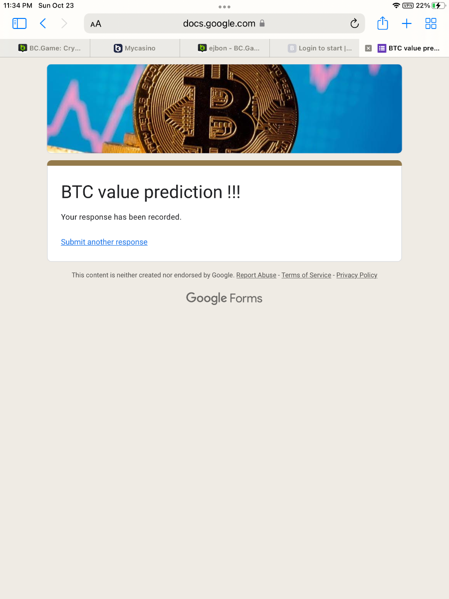 BCGAME_Bil Posted October 22, 2022 Share Posted October 22, 2022  Halloween: BTC Prediction $500 treat !!! ________________  Starts:  24 , October 02:00 AM UTC  Ends:  28 , October 01:59 AM UTC Hey BC Players! Halloween treat (no trick) , Coco is on his way !!! This time, Coco want you to share $500 treat (or take it all , maybe? ) by joining his giveaway event!  Rules: Place any bet on any of the game(s) in BC.GAME Bet result with âlostâ or "win" ,both is valid to submit the ticket id. Hedging is strictly not allowed. Multiple users with correct price range, $500 will be share equally. Submit your ideal price range by here: https://forms.gle/rjsHZ8bkaYLoNXvP9 End of date for form submit action:   01:59 UTC+0, 28 Oct 2022 Market value capture time:   12:00PM UCT+0, 31 Oct 2022 Market value refer site:   https://coinmarketcap.com/currencies/bitcoin/ Form is uneditable after submitted successful. Please pick your ideal price range carefully. Final price range reveal based on USD($).  Minimum VIP Minimum VIP 4 Level and above.  Minimum bet size Equivalent to $0.1 USD  Eligible currencies All cryptocurrencies are eligible (except JB,BCL)  How to Participate : Post your Ticket ID, along with your ticket id & screenshot, as a reply to this thread as follows. Providing the bet link is mandatory.(Exception for sport bet) Submit google form: https://forms.gle/rjsHZ8bkaYLoNXvP9 Example for reference : Ticket ID: 2178076114965115642 or  Link: https://bc.game/#/sd/10VD2L3WKXL98Z ___________________________________________________________________________________________________ In case you need some screenshot for referring :   Follow @BCGame_bilfor more interesting update !!! Link to comment Share on other sites More sharing options...