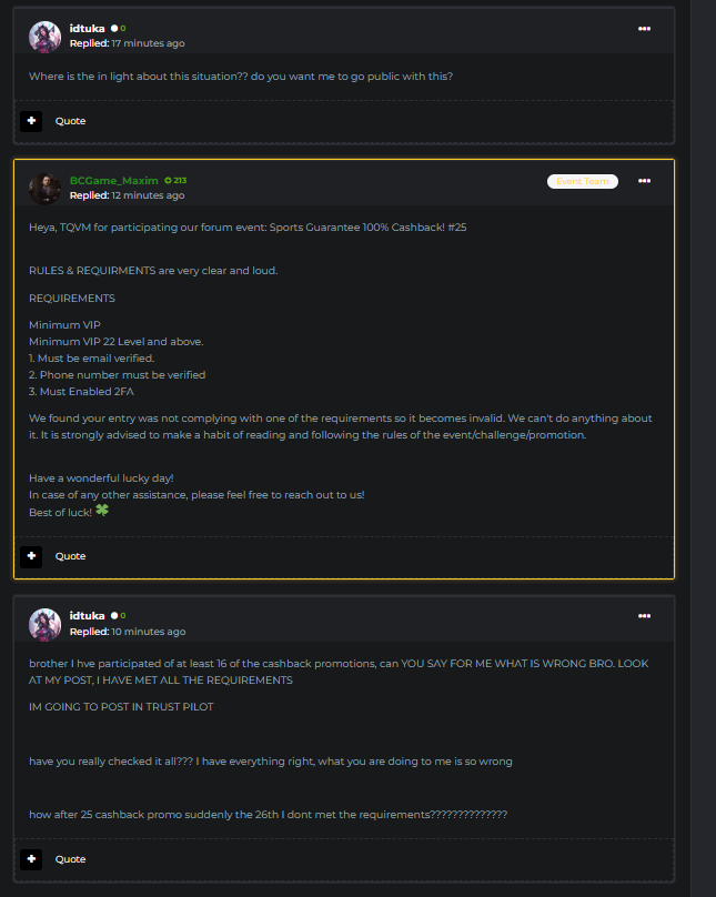Other casinos will let u join forum challenges almost anonymously for your safety I guess and will be able to claim ur prizes. Only, the verification process, which is optional, are just additional incentives when u claim ur payments like verified lvl 1(personal info) +10% of ur prize and verification lvl 2 +100%. If only bcgame will have these kind of rules then there would be lesser forum challenge issues.