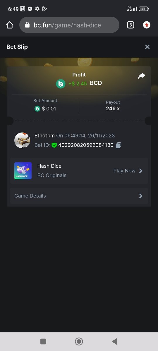 Moderator Giandreas Posted November 25, 2023 Moderator Share Posted November 25, 2023 Read Carefully Before Start To Hunt Forum Daily Challenges #429Hunt : Hashdice Win the highest pay out Min Payout : 50x Min Level 4 ️Duration Starting : Now End time : 23.59 UTC Time How to Join? Make screenshot + paste your bet link + UID or Profile link Any coin, with min bet 0.01 USD is allowed (jb/bb/bcl not allowed) Reward Prizes 1st Place.....$7 BCD 2nd Place.....$5 BCD 3rd Place.....$4 BCD 4th Place.....$3 BCD 5th Place.....$2 BCD 🏵 Winners will be announcing next day after Roll Point! Link to comment Share on other sites More sharing options...