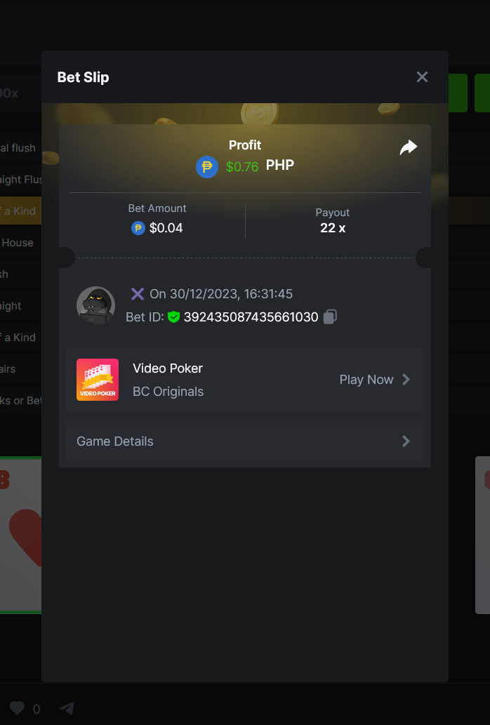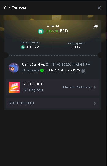 Moderator Giandreas Posted December 30, 2023 Moderator Share Posted December 30, 2023 Read Carefully Before Start To Hunt Forum Daily Challenges #464Hunt : Video Poker Win the highest pay out Min Payout : 6x Min Level 10 ️Duration Starting : Now End time : 23.59 UTC Time How to Join? Make screenshot + paste your bet link + UID or Profile link Any coin, with min bet 0.01 USD is allowed (jb/bb/bcl not allowed) Reward Prizes 1st Place.....$7 BCD 2nd Place.....$5 BCD 3rd Place.....$4 BCD 4th Place.....$3 BCD 5th Place.....$2 BCD 🏵 Winners will be announcing next day after Roll Point! Link to comment Share on other sites More sharing options...