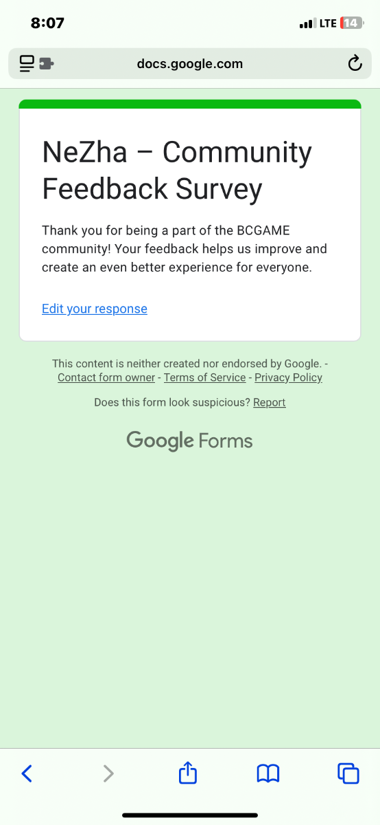 LaBubus Posted August 20 Share Posted August 20 6 hours ago, BCGame_Maxim said: NeZha Community Survey Giveaway! Share Your Feedback & Win! End date: 26th August, 2025 Hey BC.GAME Fam! NeZha has been out for a few weeks now, and we want YOUR thoughts! Whether it’s the gameplay, mechanics, or overall experience, your feedback helps us improve it! How to Participate: Complete the NeZha Feedback Survey Reply to this post with your NeZha experience! Get a chance to win exclusive surprise rewards! 20 lucky winners will score mystery prizes! Don’t miss out! Fill out the feedback form now: https://forms.gle/2sh1pfXZb5oTrSBP9 Winners will be announced on the forum after the giveaway ends. Stay tuned & good luck! https://cdn.jsdelivr.net/gh/twitter/[email protected]/assets/72x72/1f680.png Link to comment Share on other sites More sharing options...