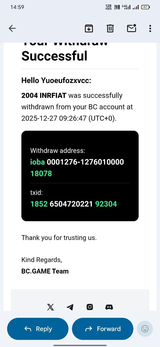 I made a withdrawal of ₹21,669 which shows as SUCCESSFUL on BC.Game.