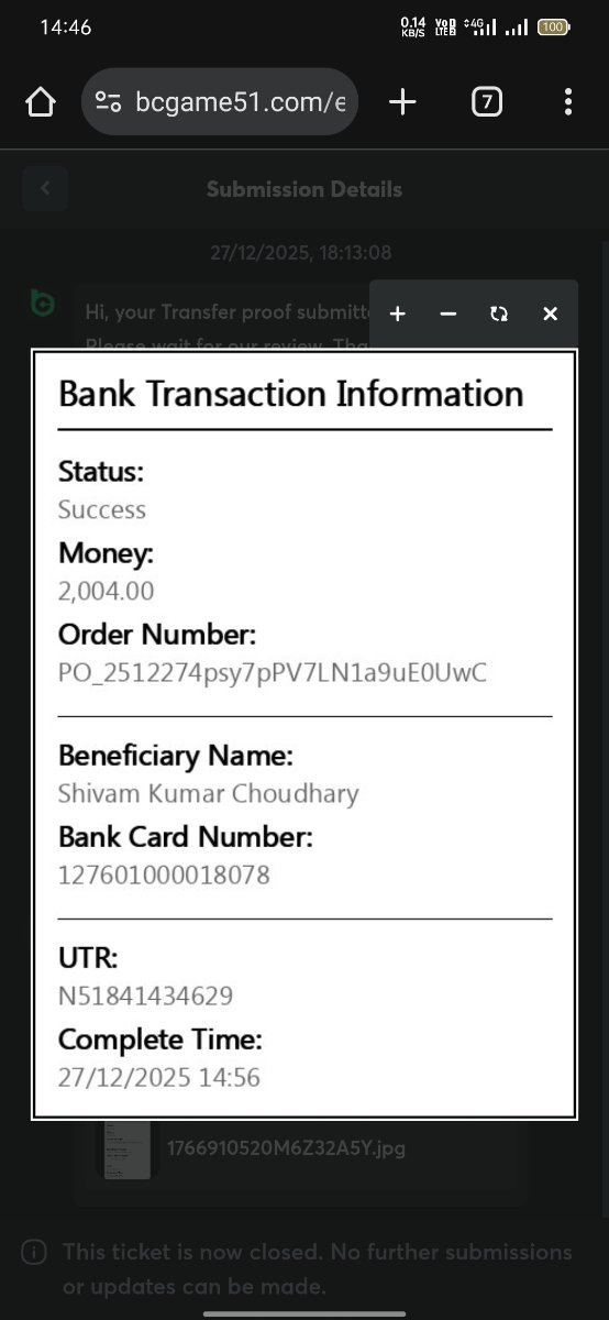 Withdrawal Successful but Amount Not Credited – UTR Provided