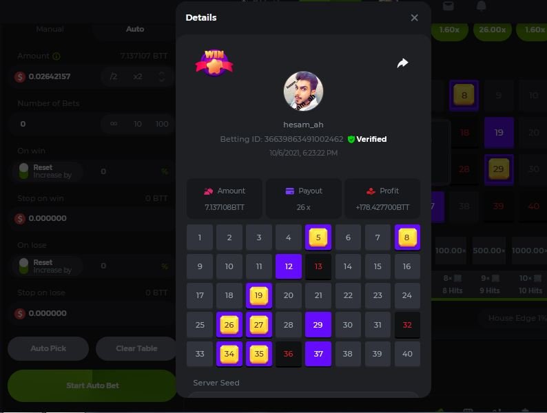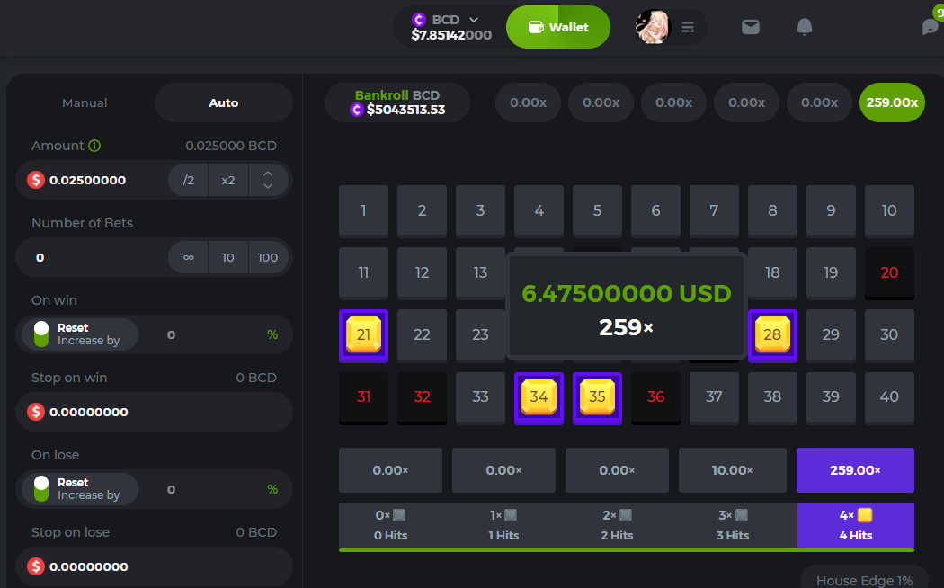The payouts must be EXACT hits  - if you can't find a payout,try changing the risk level to medium or high