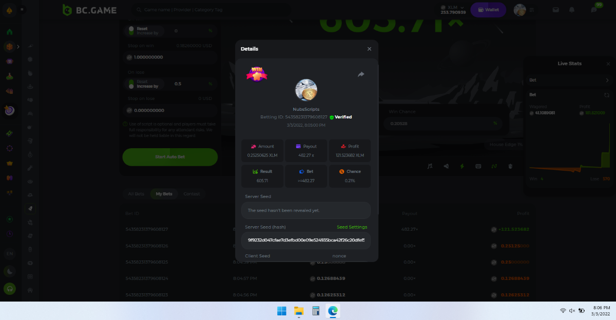 tek10 Posted January 25, 2022 Share Posted January 25, 2022 Today after my friend came over we learnt that the best way to play was through coin value rather than the coin itself so for this strategy I suggest the following Use BTC or ETH as these are high value cryptos also don't look at dollars price but only that your coin value increases. I suggest the following based on it having worked really well for my friend and that I have now also tried. The aim is to hit as many 1.7 or 1.8 continously. But ensure your covering your bet only after 3 losses as the more losses you have the harder it will be to increase. Don't use auto on this it won't work and be modest think about earing like 20 coins or 50 coins for a high loss count I have personally found about 20 losses with 1 win and again same so just cover your bet. 1st bet 1.7x increase 175% on loss 2nd bet 1.9x increase 225% on 2nd loss 3rd bet 1.6x increase 175% on 3rd loss 4th bet 3.3x increase about 100% 5th bet 5x increase about 120% In the even of further loss increase multiplier by 5 on each loss with same bet. If you want to know more feel free to drop me a message! Link to comment Share on other sites More sharing options...