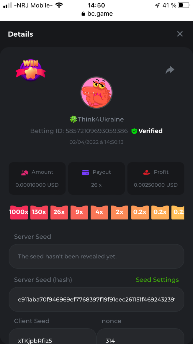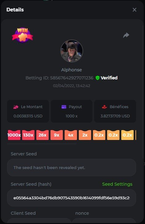 DIANA8800 Posted April 3, 2022 Share Posted April 3, 2022 On 4/2/2022 at 3:16 PM, Aksyen12 said: Bonjour à tous, c'est un challenge pour les joueurs de BC GAME en général. Soyez tous les bienvenus pour participer au concours du week-end !! Le principe est d'avoir le plus de points possible pour chaque joueur! Que le meilleur gagne, Bonne chance !! Hello everyone, this is a challenge for BC GAME players in general. Everyone is welcome to participate in the weekend contest!! The principle is to have as many points as possible for each player! May the best win, Good luck!! Jeux LIMBO et PLINKO : LIMBO : x1000 1point x2000 2points x5000 5points x7000 7points x10000 10pointsPLINKO : x26 1point x130 7points x1000 10points Réglementation : -Post the win link with the photo - Puste pour le week-end/for the weekend -Mise minimum de 0,0001 bcd / Minimum bet of 0.0001 bcd - N'importe quelle pièce autorisé sauf le JB/GB / Any part allowed except JB/GB - Tout niveau autorisé / All levels allowed 10 gagnants / 10 winners. PRIX/PRICE 62 BCD 1. 24 BCD 2. 16 BCD 3. 10 BCD 4 à 10 2 BCD ======= Bonne chance ======== Good luck!! Link to comment Share on other sites More sharing options...