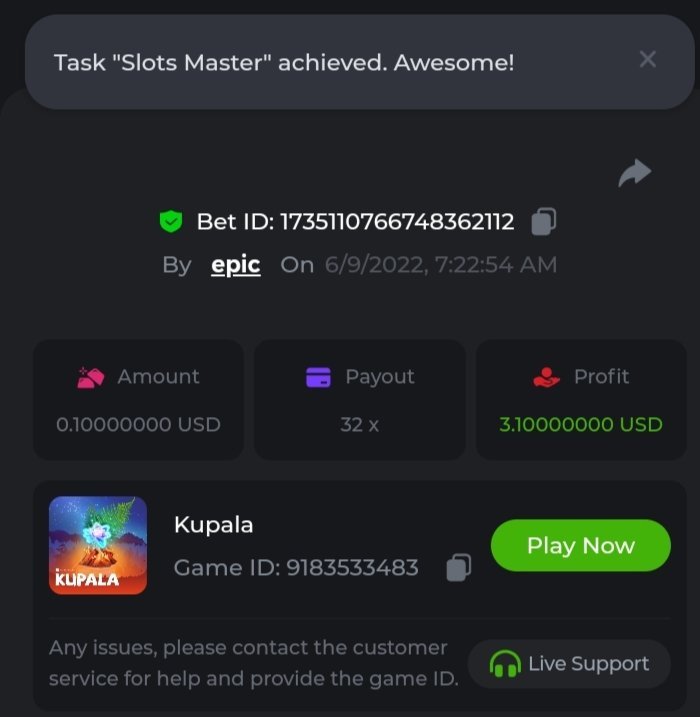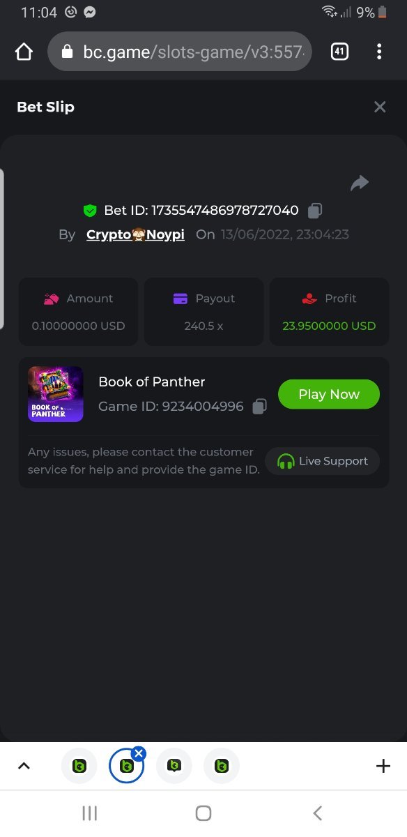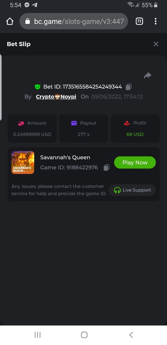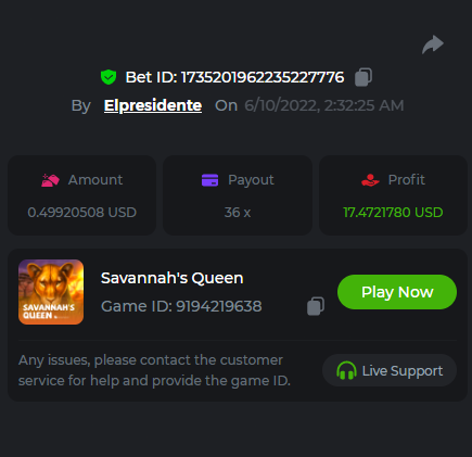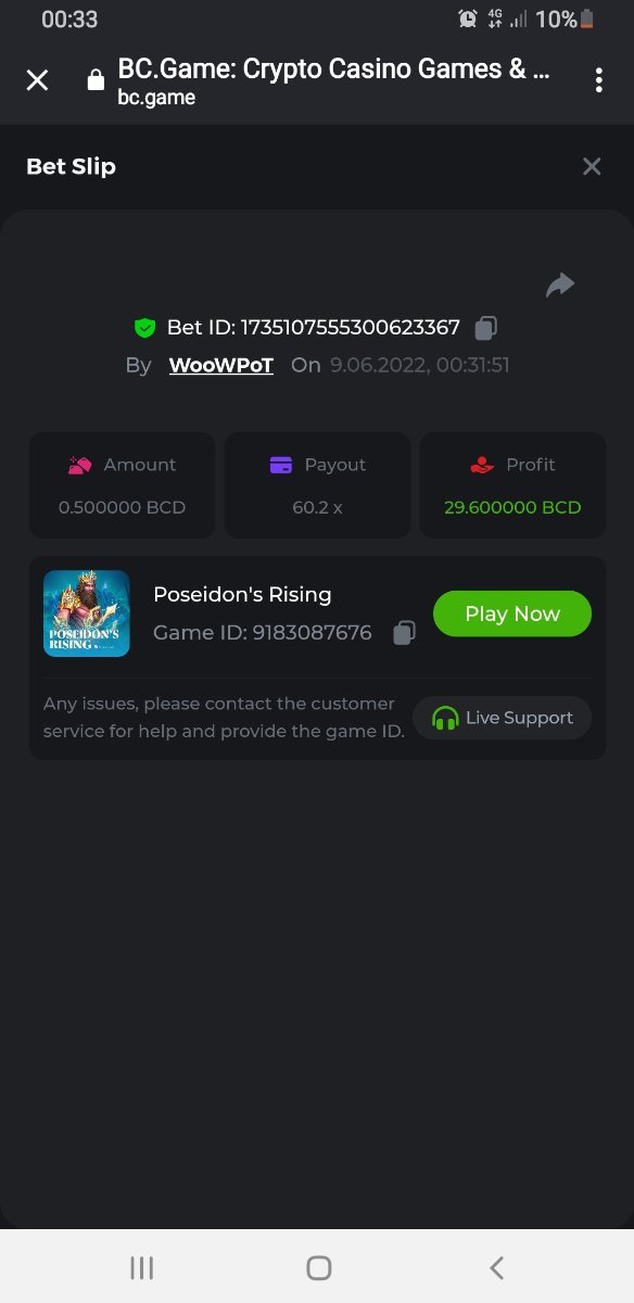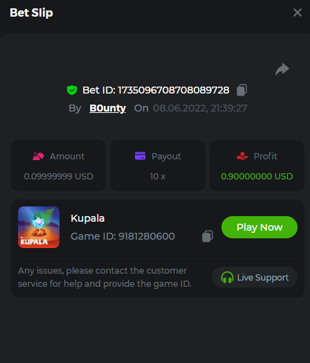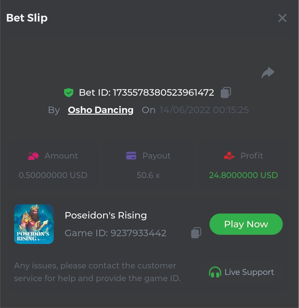 Event Team Niobium Posted June 8, 2022 Event Team Share Posted June 8, 2022 Hello Dear VIPs! Welcome back for this week's battle, we're hosting another Spinomenal event with a prize pool of up to $4,000! Participants need to hit the highest multipliers on six selected slots and payouts will be added together to rank. In addition, those who complete the bonus will receive 10% of the prize equally. Don't forget that luck is what happens when preparation meets opportunity. (details further down). Eligible Games Win the highest multiplier on the Spinomenal slots listed below Poseidon's Rising Book Of Demi Gods III Kupala Book Of Panther Golden Piggy Bank - Bling Bling Savannah's Queen The highest multiplier reached in each game will be added together and counted as total points. Bonus buys are allowed. If the player submits multiple winning entries for the same game, the entry with the highest multiplier will be valid. Minimum VIP Tier Must be VIP04 or higher in order to enter this event. Minimum Payout Minimum payout to qualify is 10x (in any game) for a valid entry. Minimum Bet Size Poseidon's Rising - $0.50 Book Of Demi Gods III - $0.10 Kupala - $0.10 Book Of Panther - $0.10 Golden Piggy Bank - Bling Bling - $0.20 Savannah's Queen - $0.25 Eligible Coins All cryptocurrencies are eligible (excepting JB, and BCL). Free Play Mode is not valid for this event. Prize Pool & Reward Breakdown The winners will win a share of the prize pool based on the detailed ranking below. Anyone who completes the side bounty will receive a share of a 10% of the prize pool. BOUNTY - Share a bet that shows exactly 51x payout on any of the six games within the timeframe of this Battle and receive a share of 10% of the prize pool! If nobody wins exactly payouts the player/s closest to the payout will win this bounty! Original rules apply with min bet, minimum payout & VIP. How to Enter Access the game to select your Bet ID, click on the Share icon (↷) and then Copy link. Return to the topic, paste the link in the field "Reply to this topic..." E.g.: https://bc.game/sd/?sd=10M8GKHQNHVUOJ Each eligible entry must have the Bet Slip URL, the non-inclusion of the link will disqualify participation in the event. In the same post, upload a screenshot of your win by clicking the game ID WITH VIEW IN USD mode ENABLED (accessible at the bottom of dropdown menu for your wallet up top, and Submit Reply. Done! This way, we can ensure that your bet indeed met the minimum requirement at the time of placing it: Example post - Link: https://bc.game/sd/?sd=10M8GKHQNHVUOJ Good luck everyone! Link to comment Share on other sites More sharing options...